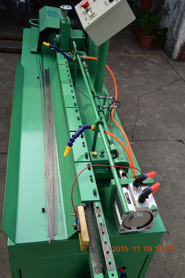 氣動(dòng)調(diào)直機(jī)結(jié)構(gòu)是由高速轉(zhuǎn)子旋轉(zhuǎn)調(diào)整直絲模角度,達(dá)到調(diào)直的效果,然后通過叨絲輪向前叨絲。達(dá)到要求尺寸后,絲碰到定位鍵后把跑道向前進(jìn)推進(jìn)5毫米,上方?jīng)_頭壓住豎切絲刀就立刻切斷,絲通過豎絲刀上的壓板壓住開口軸承,絲就自動(dòng)掉至托絲架,如果要改變長(zhǎng)度,就移動(dòng)定位鍵。